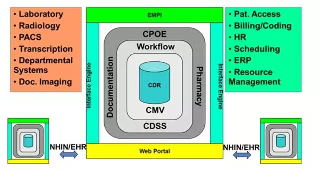 該圖是美國最有影響的醫(yī)療衛(wèi)生信息化組織HIMSS的智庫HIMSS Analytics公司給出的一個EMR體系架構(gòu)示意圖。圖中電子病歷系統(tǒng)的基本構(gòu)件包括居于核心的臨床文檔存儲庫CDR(Clinical Data Repository),包圍著CDR的是可控醫(yī)學(xué)術(shù)語服務(wù)CMV(Control Medical Vocabulary), 再外層是工作流(Workflow)與臨床決策支持系統(tǒng)CDSS(Clinical Decision Support System),第四層是醫(yī)生工作站、藥品服務(wù)與文獻服務(wù),最外層是病人主索引EMPI,Web門戶和通用的接口引擎(Interface Engine)。